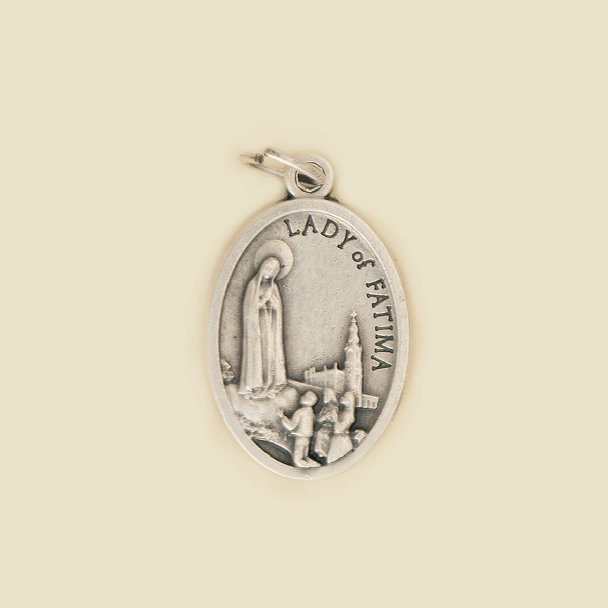 The premium quality of this Our Lady of Fatima medal makes it the perfect gift for Marian devotees young and old! This detailed medal shows Our Lady of Fatima mid apparition, just as the children described her. Lucia, Francisco, and Jacinta kneel below in humble reverence for the Mother of God. The Basilica of Our Lady of the Rosary stands tall in the background, its iconic spire pointing our gaze to heaven.